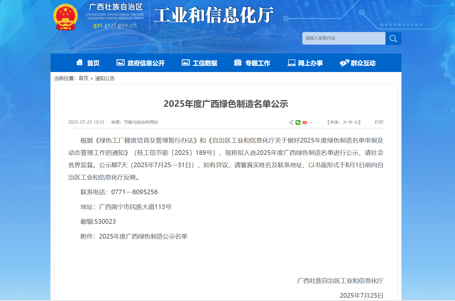 根据广西壮族自治区工业和信息化厅7月25日发布的《2025年度绿色制造名单公示》,广西钦州澄星化工科技有限公司入选省级绿色供应链管理企业名单!这是钦州澄星继2024年连续获得省级、国家级 “绿色工厂”荣誉后,在绿色制造方面取得的又一殊荣。